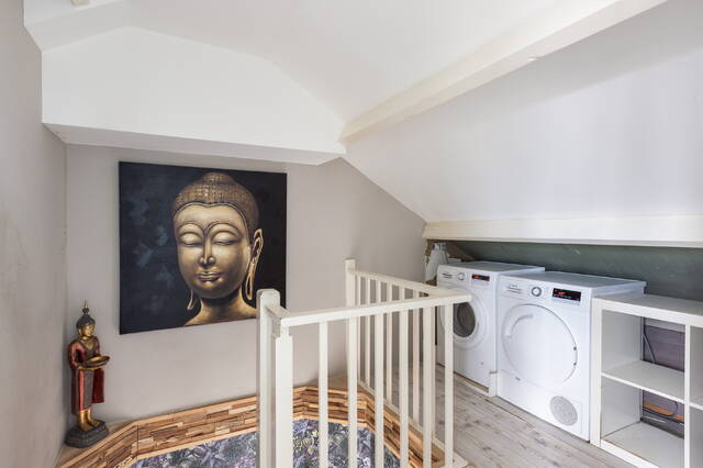 De tweede verdieping bestaat uit de voorzolder en een zeer royale slaapkamer. Op de voorzolder zijn de aansluitingen voor de wasmachine en droger aanwezig, waardoor deze verdieping ook praktisch in gebruik is.