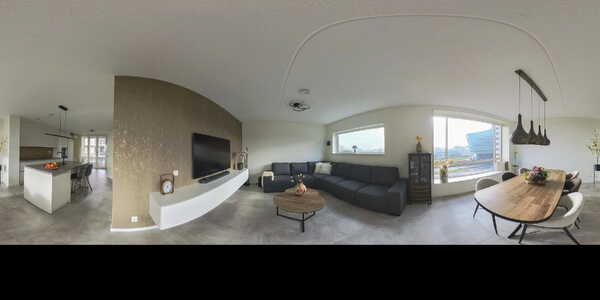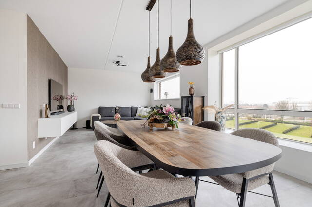 De woonkamer is royaal genoeg om een eettafel met zes stoelen te plaatsen, terwijl er tegelijkertijd ruimte blijft voor een comfortabele zithoek. De grote hoekbank staat prettig gepositioneerd in de ruimte en laat voldoende loopruimte over tussen het woongedeelte en het eetgedeelte. Hierdoor voelt de woonkamer open en overzichtelijk aan, met een duidelijke maar natuurlijke verdeling van de verschillende functies.