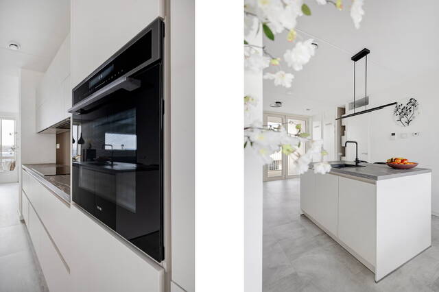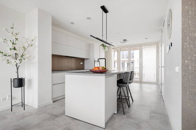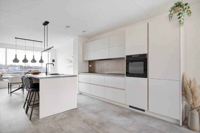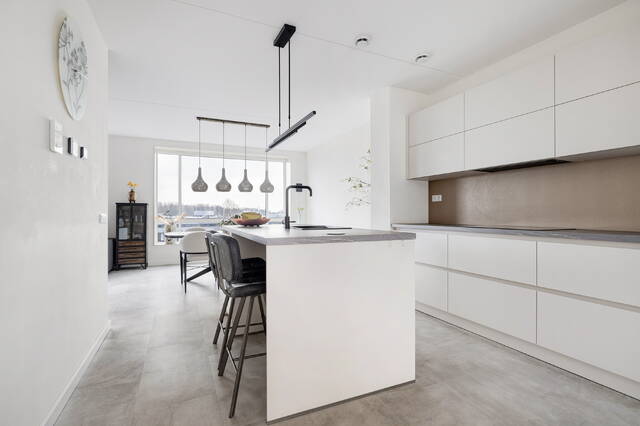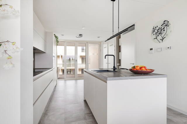 Bij binnenkomst valt direct de eyecatcher van de woning in het oog: de keuken. De ruimte is fijn opgezet en vormt het hart van het appartement, waar koken en samen zijn op een prettige manier samenkomen.