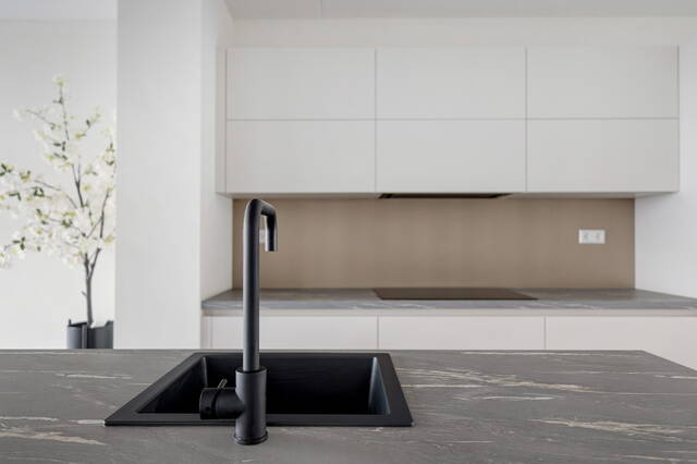 Centraal in de ruimte bevindt zich het spoeleiland, dat zorgt voor extra werkruimte en een gezellige indeling. Aan een zijde is ruimte voor twee barkrukken, waardoor u hier kunt eten of eenvoudig kunt aanschuiven tijdens het koken. Het eiland is voorzien van een lichtgrijs aanrechtblad en een handig ingezonken stopcontact.