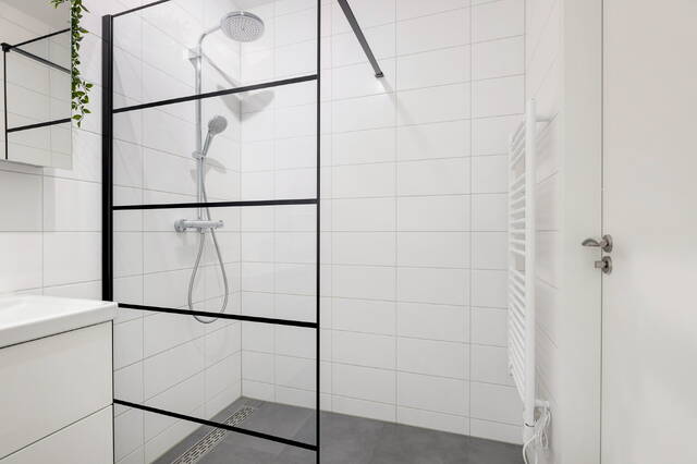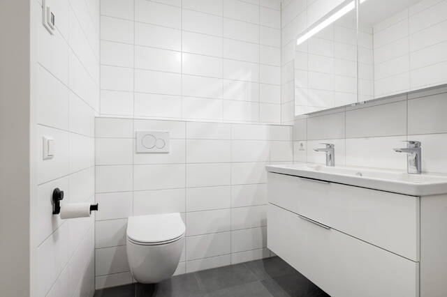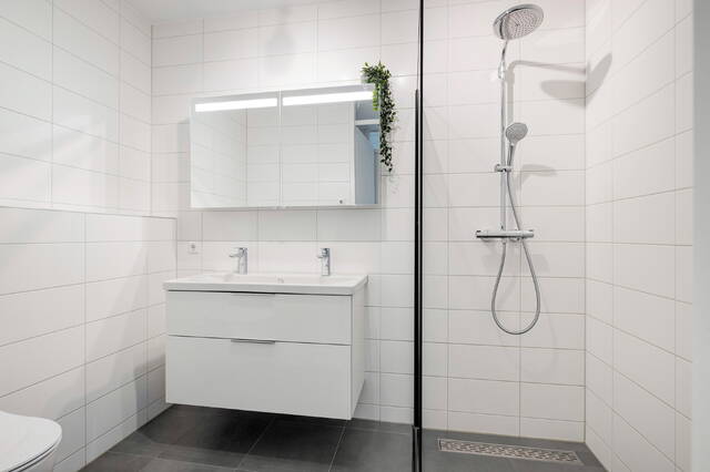 De badkamer is modern en verzorgd uitgevoerd en sluit naadloos aan bij de luxe afwerking van het appartement. De ruimte beschikt over een inloopdouche, een brede wastafel met twee kranen en twee lades en een zwevend toilet, wat zorgt voor comfort en gebruiksgemak.