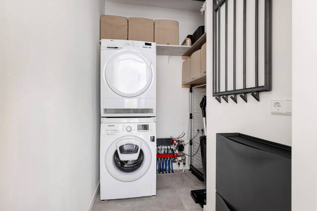 Daarnaast beschikt het appartement over een praktische bergruimte. Hier bevinden zich de aansluitingen voor de wasmachine en droger, evenals de verdeler van de vloerverwarming. De ruimte biedt bovendien voldoende plek om extra spullen op te bergen, wat zorgt voor extra gemak en functionaliteit in het dagelijks gebruik.