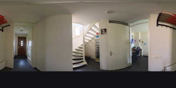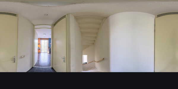 Bij binnenkomst wordt u verwelkomd in een ruime hal, waar u direct de mogelijkheid heeft om uw jas en schoenen netjes op te bergen. De strakke gestuukte witte wanden en het antracietkleurige laminaat, dat de uitstraling heeft van stoere tegels, geven de entree een moderne en frisse sfeer.