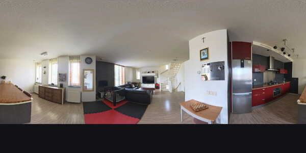 Op de eerste verdieping vindt u de royale woonkamer waar het licht rijkelijk naar binnen valt dankzij de grote raampartijen. De strak gestuukte muren en plafonds zorgen voor een moderne uitstraling, waarbij één wand met stijlvol behang de ruimte net dat beetje extra karakter geeft. De gehele verdieping is voorzien van een natuurkleurige bruin/grijze laminaatvloer, afgewerkt met hoge plinten die de ruimte een nette en eigentijdse uitstraling geven. Hier heeft u alle ruimte om een comfortabele zithoek te creëren, terwijl u geniet van de fijne lichtinval.