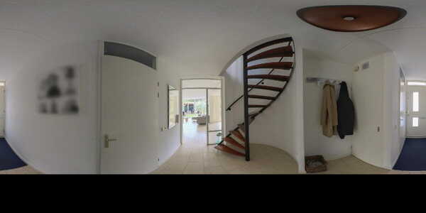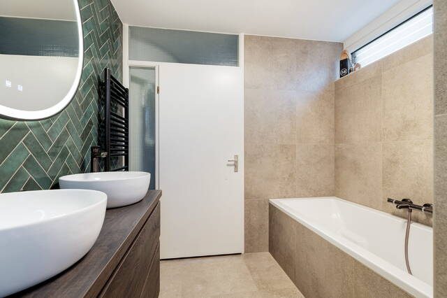 De glazen paneeldeur geeft toegang tot de sfeervolle woonkamer. De lichte plavuizen vloer met vloerverwarming zorgt voor comfort, terwijl de grote raampartijen en de ronde glazen pui aan de tuinzijde een prachtig uitzicht bieden over de achtertuin. De moderne schouw met gashaard en airconditioning (koeling/verwarming) maken het geheel compleet.
