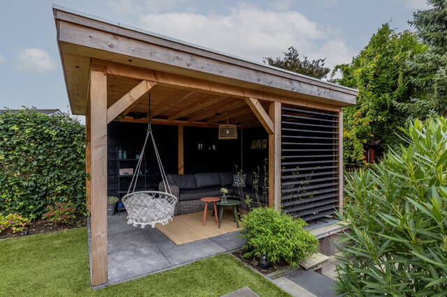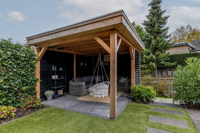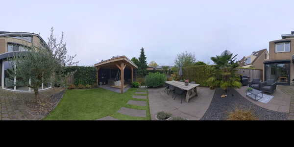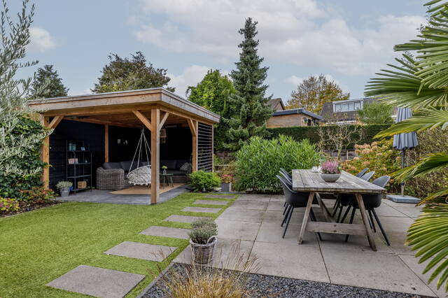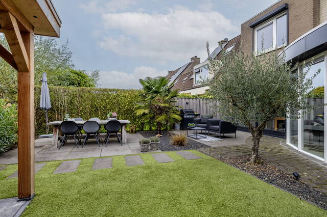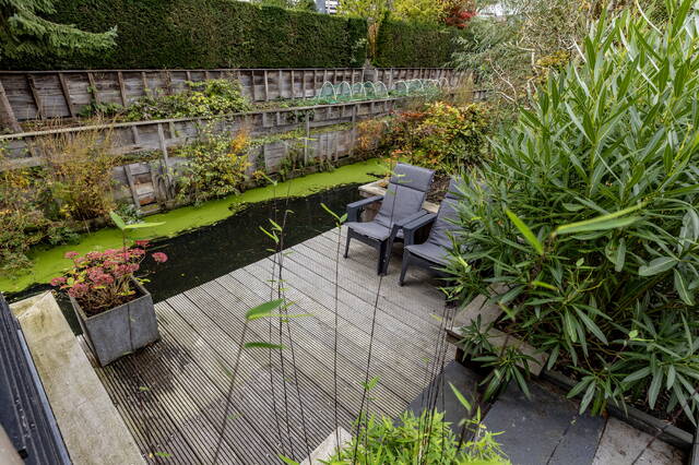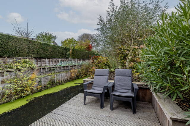 De achtertuin ligt op het westen en is een ware oase van rust. Fraai aangelegd met kunstgras, volwassen groen – waaronder een olijfboom, palm en perenboom – en een recent vernieuwde beschoeiing en vlonderterras aan de waterkant. Achter in de tuin bevindt zich een sfeervolle veranda van Douglas hout, perfect voor een loungehoek met uitzicht over de gezellige tuin.