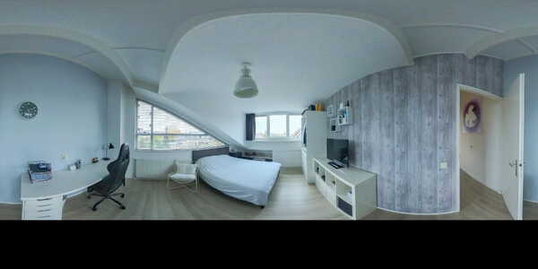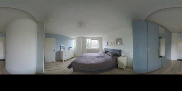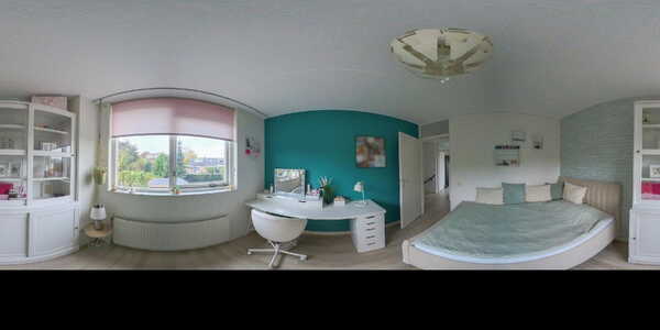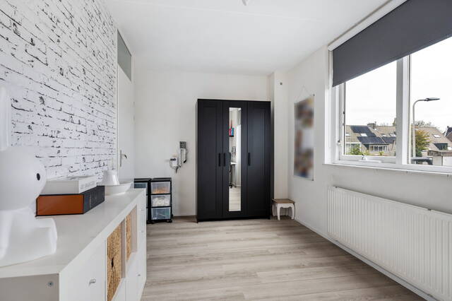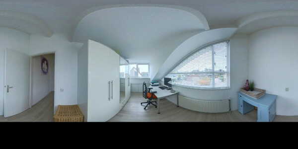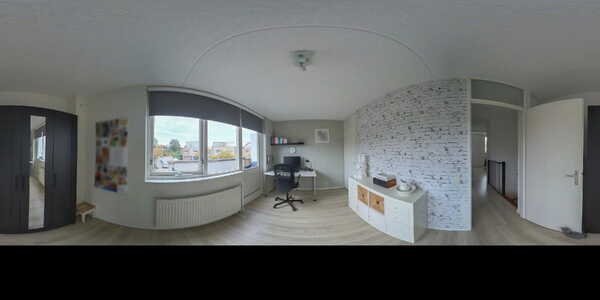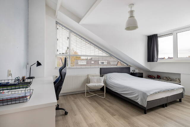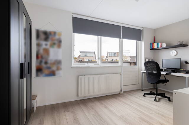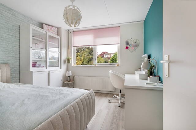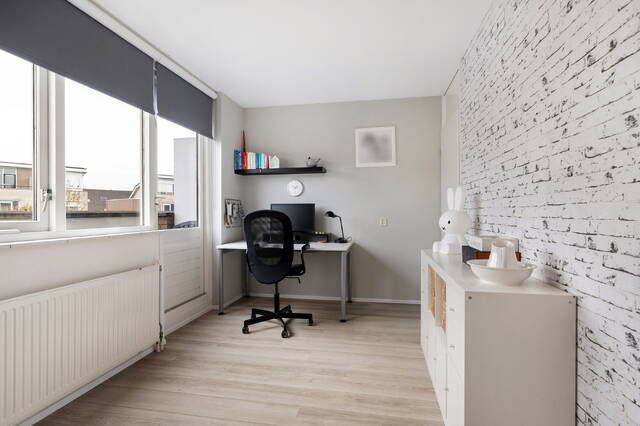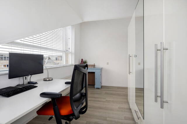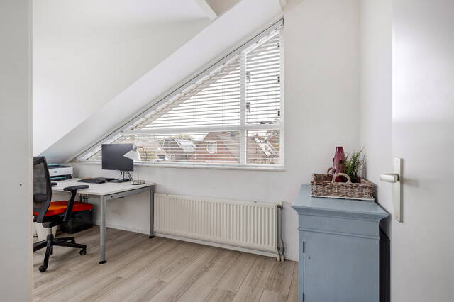 Slaapkamer 4 ligt aan de voorzijde, is nu ingericht als werkkamer maar biedt voldoende ruimte om als slaapkamer te fungeren. Slaapkamer 5 ligt aan de achterzijde.