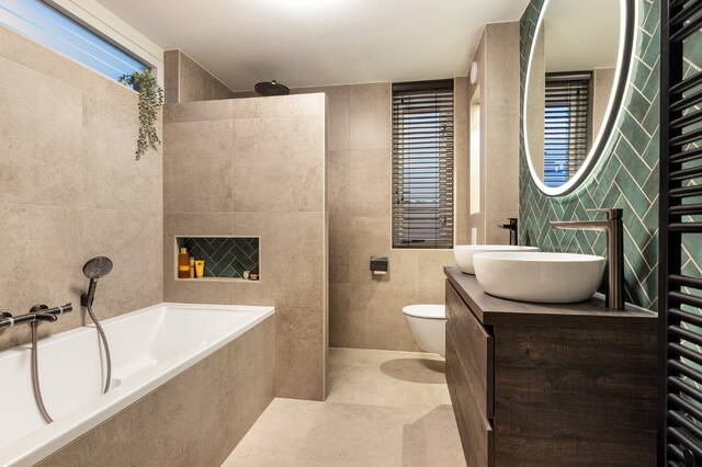Slaapkamer 1 ligt aan de achterzijde en beschikt over een ruime kastenwand en een luxe badkamer en suite. Deze badkamer is uitgevoerd in warme beige tinten en voorzien van een ligbad, inloopdouche, hangend toilet, dubbel wastafelmeubel met twee waskommen, verwarmde en verlichte spiegel en stijlvolle gunmetal kranen.