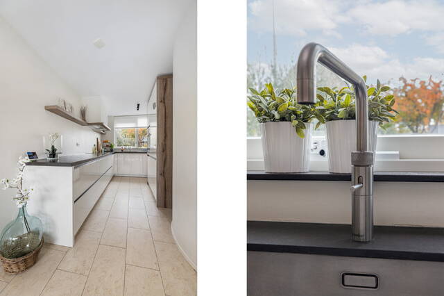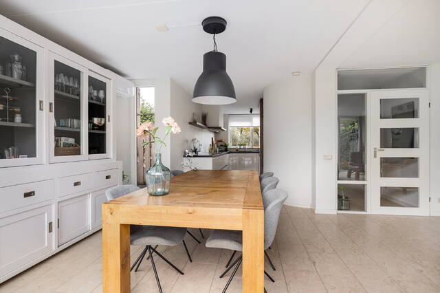 Het eetgedeelte grenst aan de schuifpui naar de tuin (voorzien van elektrisch rolluik), ideaal voor lange zomeravonden. De halfopen keuken aan de voorzijde is luxe uitgevoerd in wit hoogglans met een donkergrijs composiet werkblad. De keuken is voorzien van hoogwaardige inbouwapparatuur, waaronder een combi-oven, koel-vriescombinatie, vaatwasser, 5-pits inductiekookplaat met geïntegreerde afzuigkap, Quooker-kraan, apothekerskast en praktische LeMans-carrouselkast.