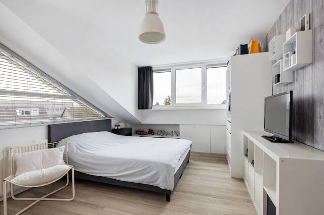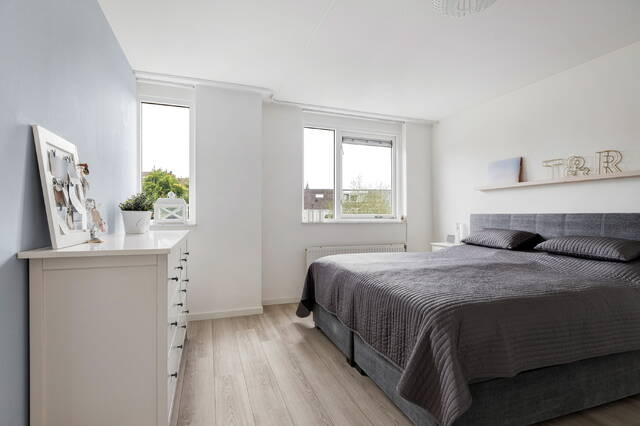 Slaapkamer 2 ligt aan de voorzijde, heeft een vaste kast en toegang tot het balkon.