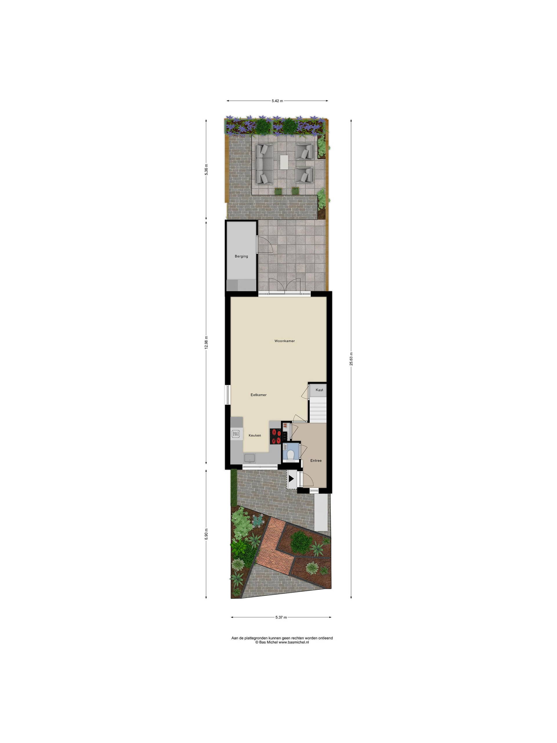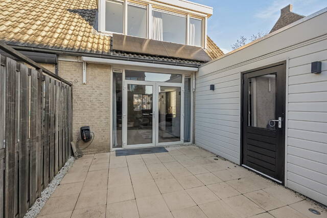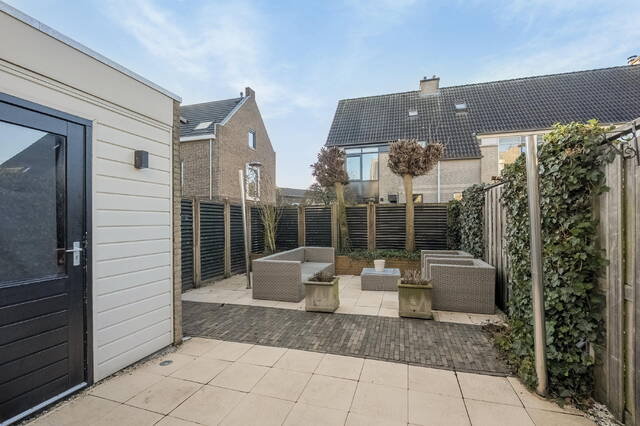 De achtertuin op het zuiden is een verlengstuk van de woonkamer. Zonnig, verzorgd aangelegd met sierbestrating en omringd door houten schuttingen. Het elektrisch bedienbare zonnescherm zorgt voor schaduw op warme dagen. Via de poort aan de zijkant ben je zo buitenom. De aangebouwde houten berging is ideaal voor fietsen, gereedschap en tuinspullen.