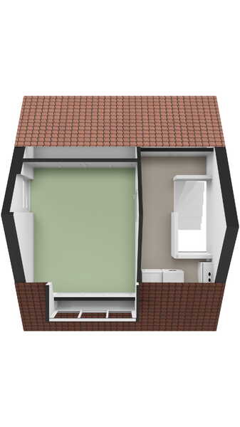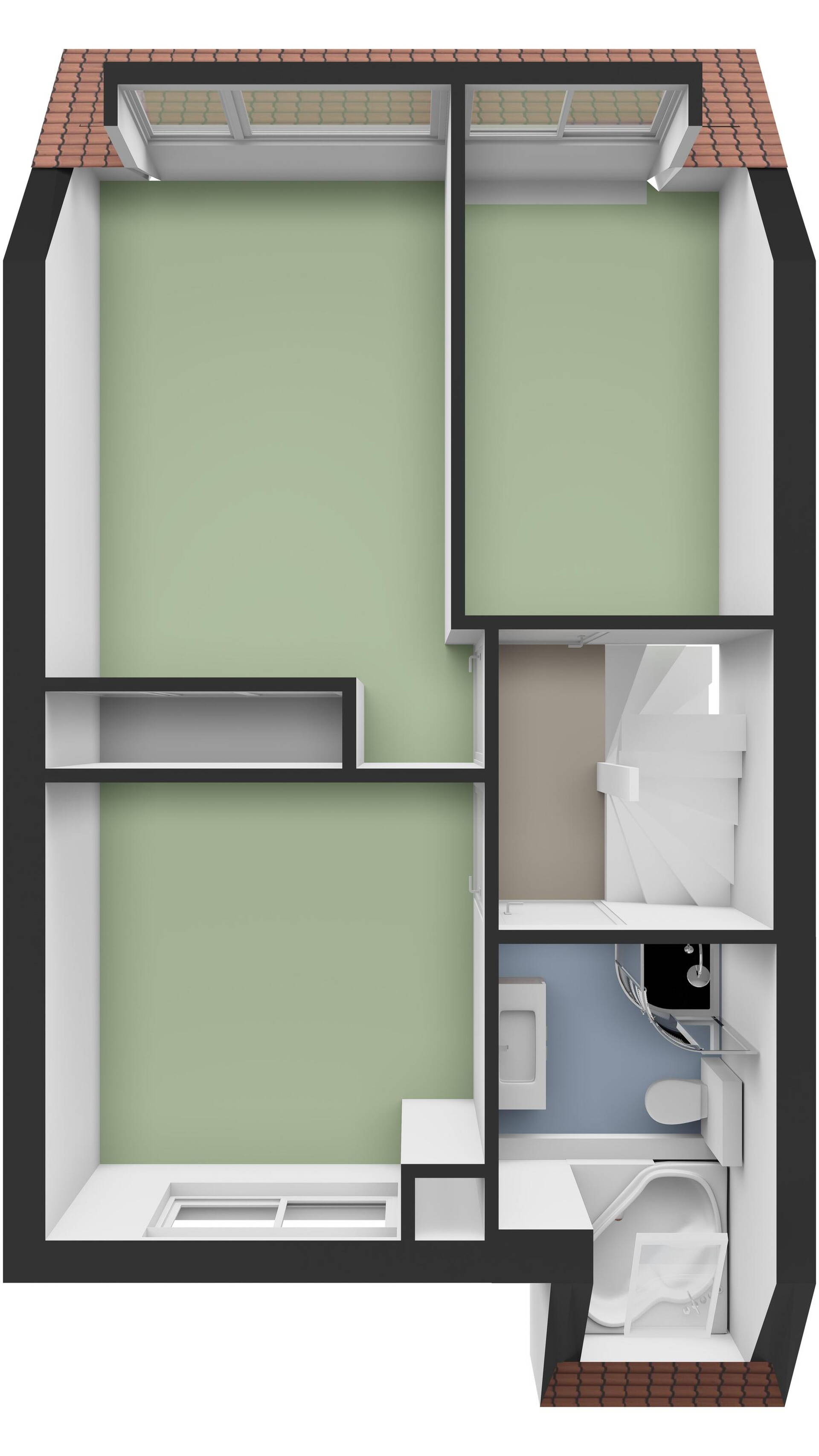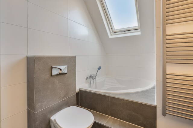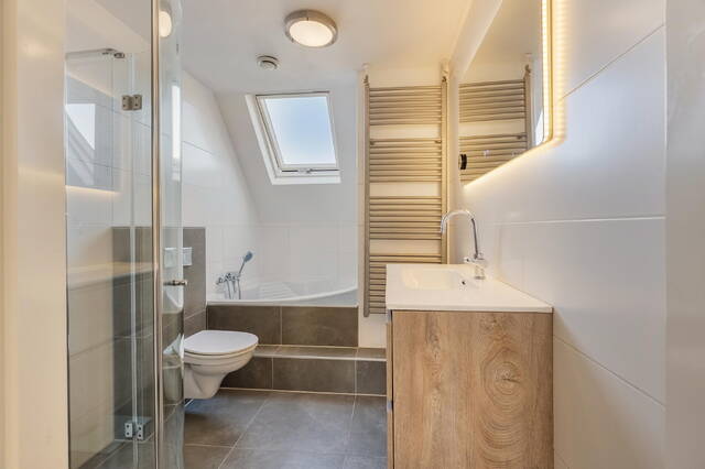 De badkamer bevindt zich aan de voorzijde en is compleet uitgevoerd. Hier begin je de dag rustig met een douche in de aparte inloopdouchecabine of sluit je af met een warm bad in het hoekbad. Verder is de badkamer voorzien van een wastafelmeubel met spiegel met verlichting en verwarming en een tweede hangend toilet. De wit/grijze betegeling zorgt voor een frisse, tijdloze uitstraling.