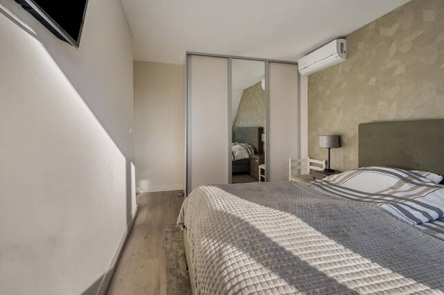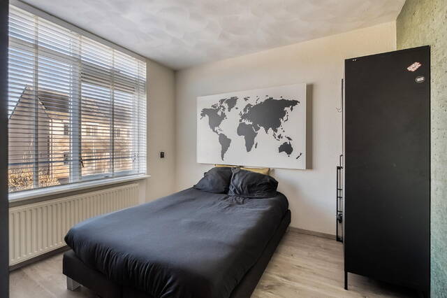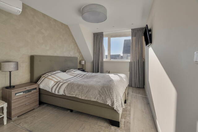 De hoofdslaapkamer ligt aan de achterzijde en voelt als een echte privéplek. Voorzien van airconditioning, een kunststof dakkapel, een vaste schuifkastenwand, een elektrisch bedienbare screen, glad gestucte wanden en plafond en inbouwspots. Een kamer waar je je echt even kunt terugtrekken.