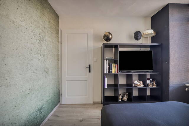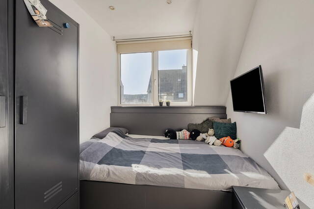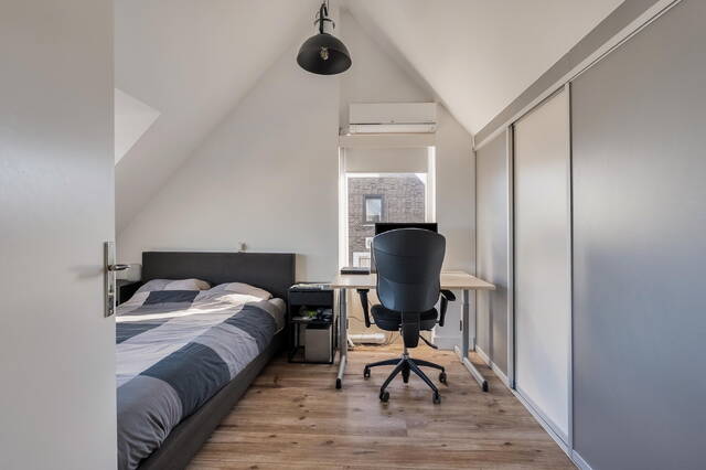 Slaapkamer twee, eveneens aan de achterzijde, is perfect als kinder-, werk- of logeerkamer en beschikt over een elektrisch bedienbare screen, laminaatvloer en spachtelputz wanden.