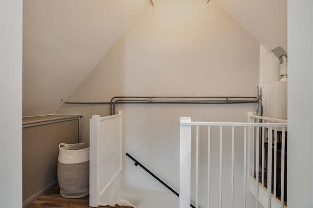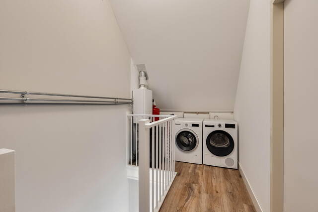 De tweede verdieping verrast door de ruimte. Op de overloop vind je de wasmachine- en drogeropstelling, de CV-installatie en handige bergruimte achter de knieschotten.
