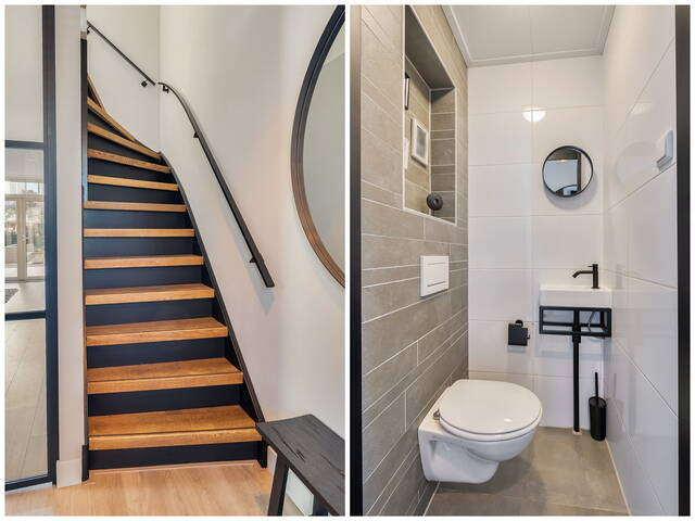 Je komt binnen in een ruime hal waar direct de nette afwerking opvalt. Hier vind je de meterkast met 3 fase aansluiting (3x 25 Amp), de toiletruimte en de trap naar de eerste verdieping. De trap is afgewerkt met houten bekleding en zwart stalen trapleuningen – een stoer detail dat meteen sfeer brengt. Het toilet is modern uitgevoerd in grijs/wit tegelwerk en voorzien van een hangend toilet en fonteintje.