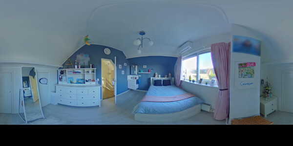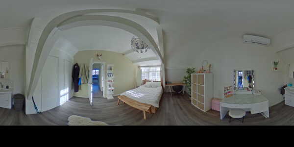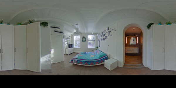 Een multifunctionele ruimte (thans slaapkamer) met een eigen, luxe badkamer met inloopdouche, dubbele wastafel en toilet.