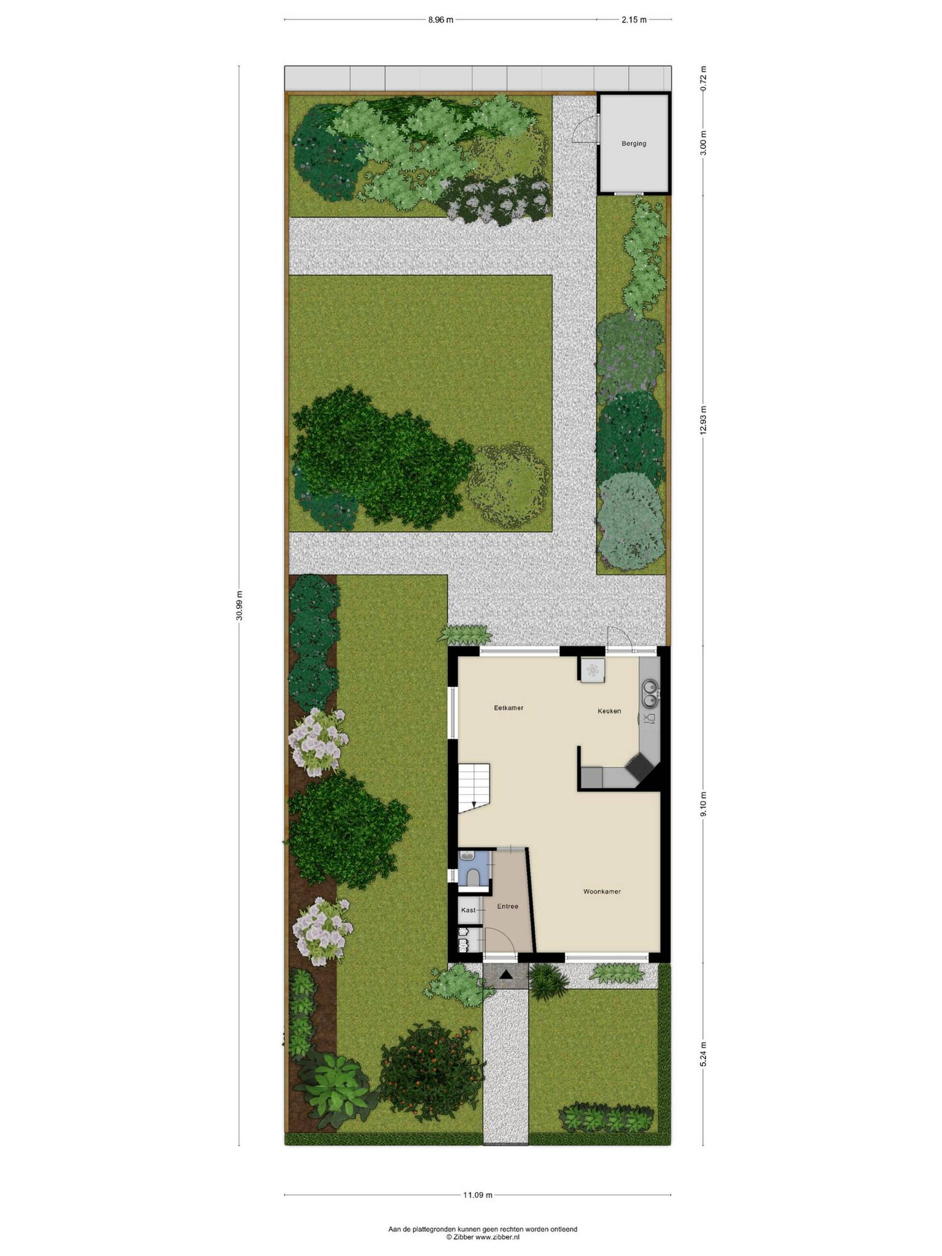 Vanuit de keuken stap je de tuin in. Wat een tuin! Door de breedte van ruim 11 meter is dit echt een enorme tuin. Als je nog geen groene vingers had, dan krijg je ze hier wel! De tuin is mooi verdeeld in een deel waar je lekker kunt eten onder het bijna 5 meter brede zonnescherm. Achter de groene border ligt een een flink stuk gras en een leuke zit in de achtertuin. Daar treffen we ook de stenen berging van 6 m2.