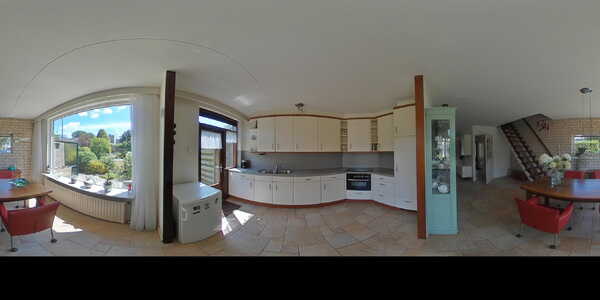 Dan lopen we naar achteren waar we een prachtige open ruimte hebben voor de eettafel. Het licht dat door het zijraam komt geeft echt een extra dimensie. Ook de enorme pui aan de achterzijde geeft heerlijk veel licht. Het eetgedeelte staat in open verbinding met de keuken aan de achterzijde. Dat is een mooie grote ruimte waar je waarschijnlijk een nieuwe keuken in zult plaatsen. Er is meer dan genoeg ruimte voor het geliefde kookeiland waar veel mensen dol op zijn.
