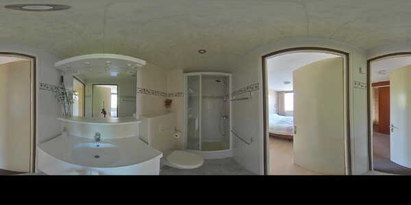 De badkamer is zowel toegankelijk vanuit de hal als vanuit de hoofdslaapkamer. Een keurige badkamer voorzien van een ruime douchecabine met een fijn plateau waar je de douchespullen op kwijt kunt. Daarnaast is er een grote wastafel met wastafelmeubel en spiegel met planchet en verlichting erboven. Daarnaast treffen we hier het tweede toilet.