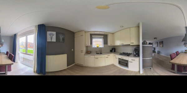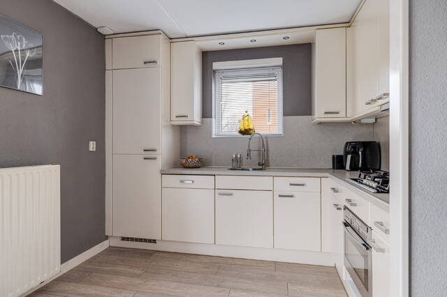 Vanuit de hal bereik je de lichte woonkamer met laminaatvloer en spachtelputz wanden. Via de schuifpui loop je zo de zonnige achtertuin in. De open keuken bevindt zich aan de voorzijde in hoekopstelling en is uitgerust met:
