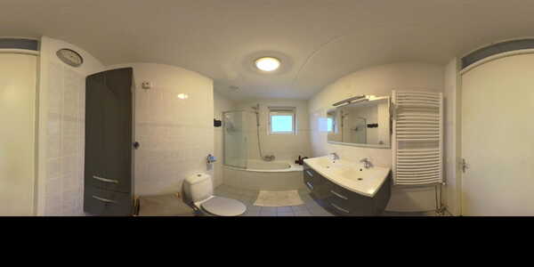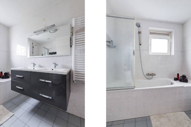 – geheel betegeld met witte wandtegels en grijze vloertegels