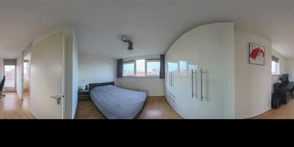 Slaapkamer 4 – royale slaapkamer met vaste kastenwand, laminaatvloer en directe toegang tot het dakterras.