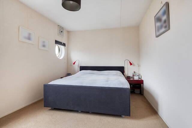 Slaapkamer 1 – gelegen aan de zijkant, voorzien van een vaste schuifkastenwand en vloerbedekking.