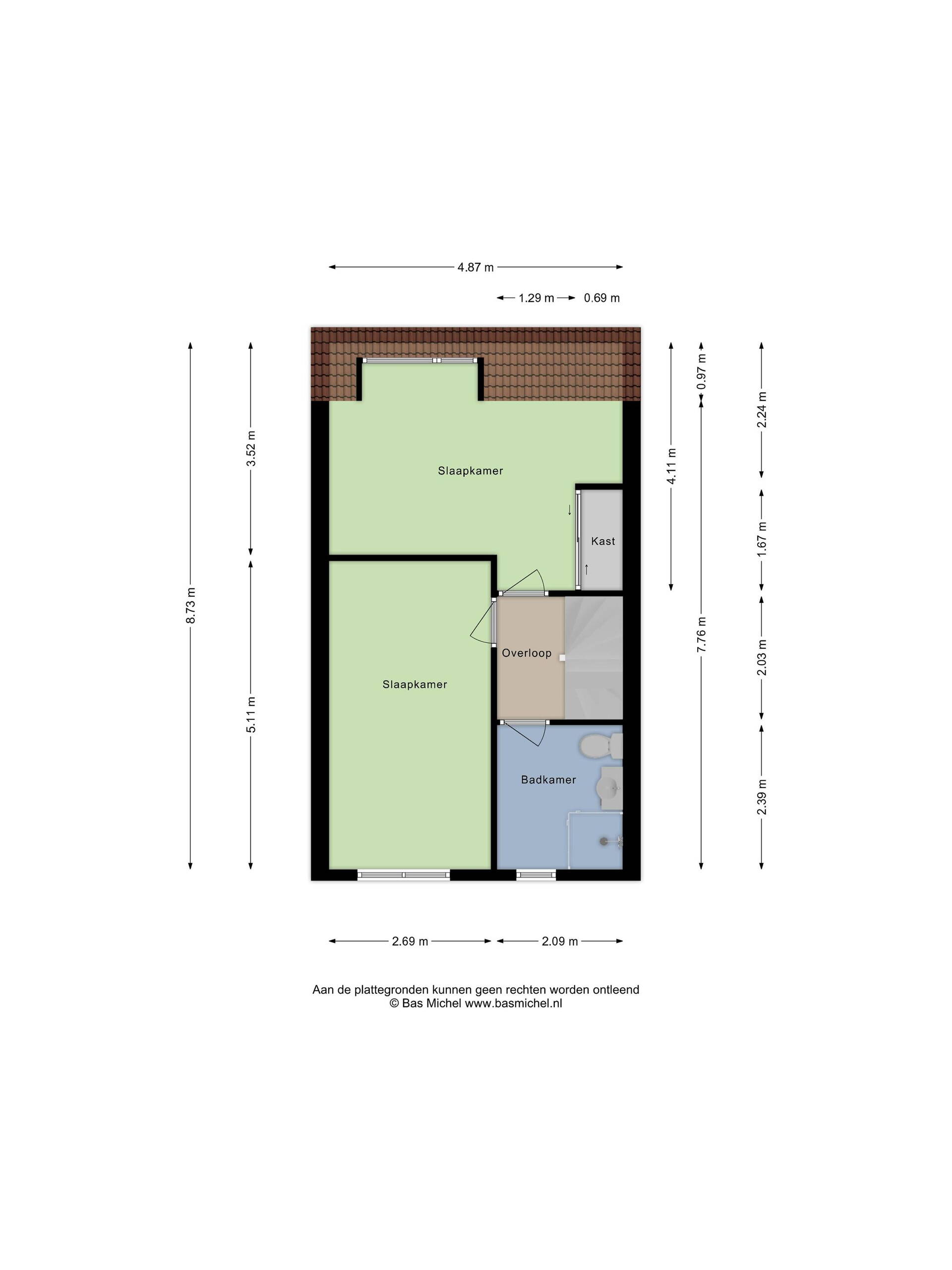 De overloop biedt toegang tot twee slaapkamers en de badkamer.