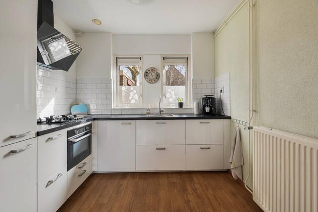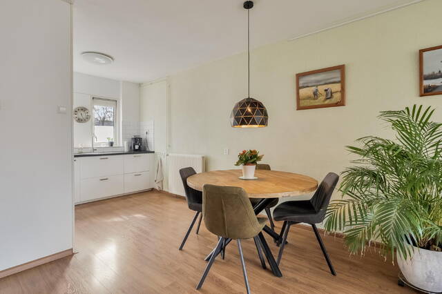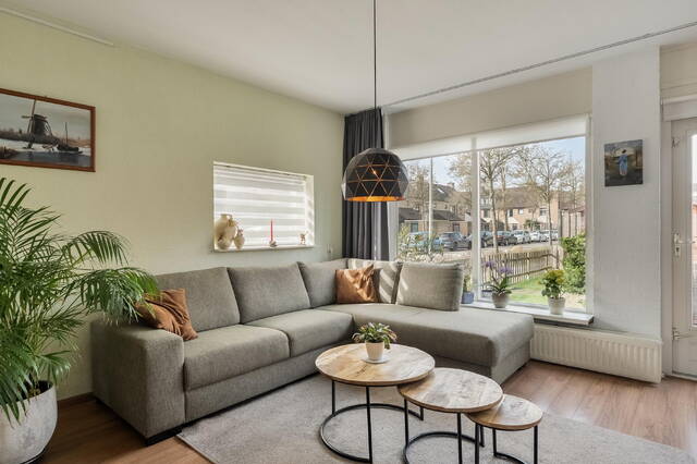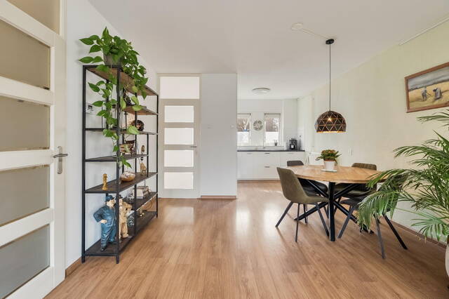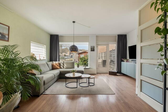 De tuingerichte woonkamer vormt het hart van de woning. Grote ramen zorgen voor een prettige lichtinval en bieden uitzicht op de achtertuin. Via een loopdeur bereikt u direct de tuin. De woonkamer is afgewerkt met een laminaatvloer, wat zorgt voor een nette en verzorgde uitstraling.