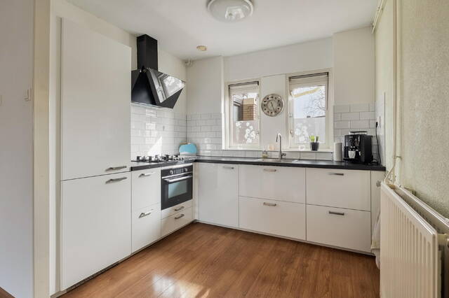 Aan de voorzijde van de woning bevindt zich de open keuken in een praktische hoekopstelling, welke in 2022 is vernieuwd. De keuken is uitgevoerd in een lichte kleurstelling met een donker kunststof werkblad en beschikt over diverse inbouwapparatuur, waaronder een combi-oven, 4-pits gaskookplaat met zwart glazen afzuigkap, koel-vriescombinatie en een carrouselkast. Dankzij de vele lades en kasten is er voldoende bergruimte aanwezig.