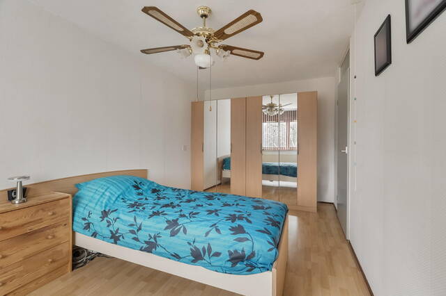 Slaapkamer 2 ligt aan de achterzijde en beschikt over een dakkapel, waardoor extra ruimte en licht is ontstaan. De kamer is voorzien van een laminaatvloer en een vaste schuifkastenwand, wat zorgt voor praktische opbergruimte.