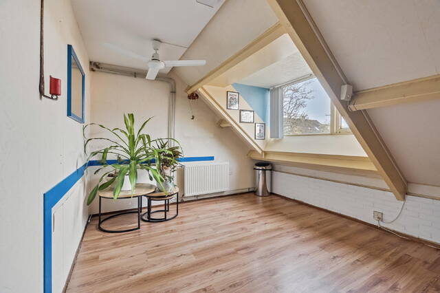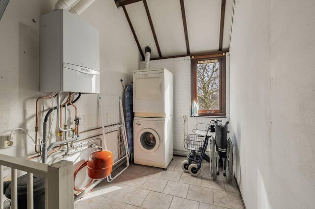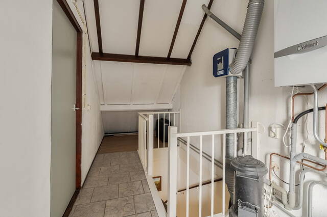 Op de voorzolder bevinden zich de aansluitingen voor wasmachine en droger en de cv-installatie. Dankzij de hoge nok en het aanwezige raam voelt deze verdieping ruim en licht aan.