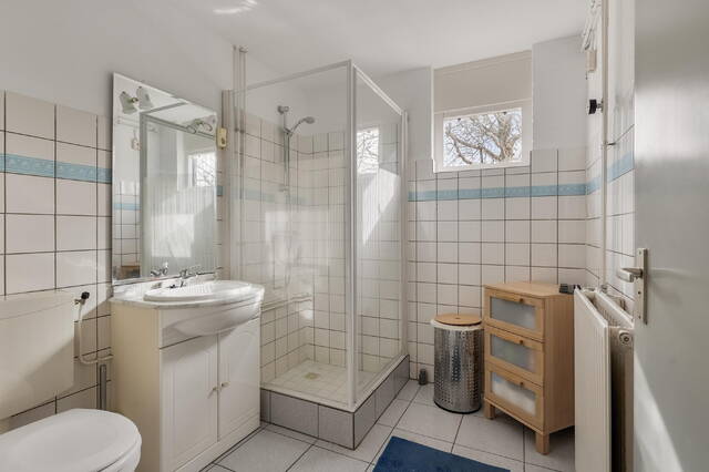 De badkamer, gelegen aan de voorzijde, is ruim van opzet en momenteel voorzien van een douchecabine, wastafelmeubel en een duoblok toilet. De ruimte is gedeeltelijk licht betegeld en functioneel ingericht. Hoewel de badkamer enigszins gedateerd is, biedt de ruimte uitstekende mogelijkheden om hier een moderne badkamer naar eigen smaak te realiseren.