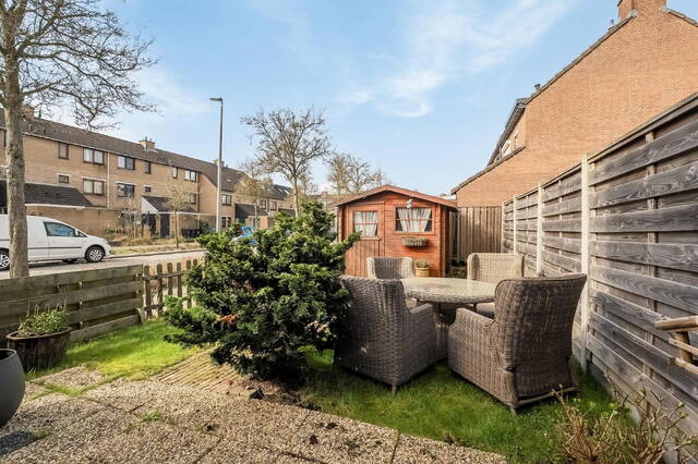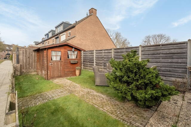 De achtertuin, gelegen op het noordwesten, is aangelegd met een combinatie van gras en sierbestrating. Hierdoor is er voldoende ruimte voor zowel een terras als speelruimte. Achterin de tuin bevindt zich een vrijstaande houten berging, ideaal voor het opbergen van fietsen en tuingereedschap. Aan de straatzijde is de tuin afgesloten met een hek.