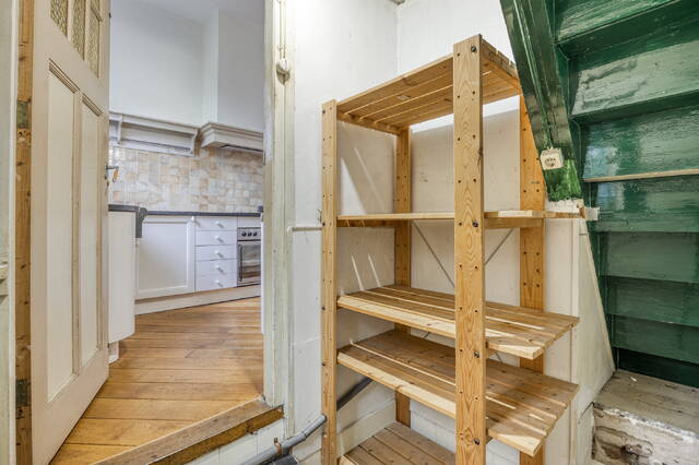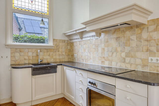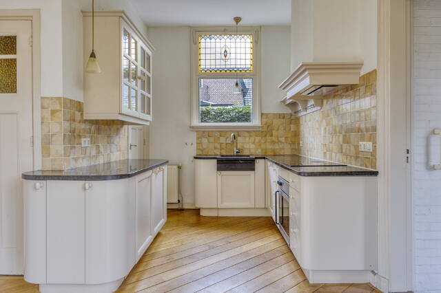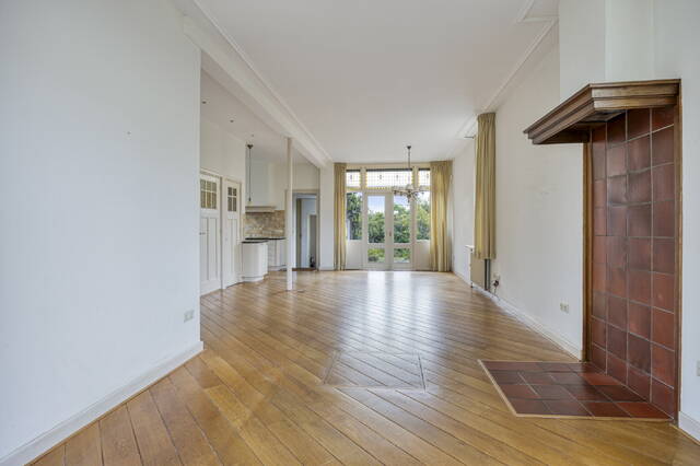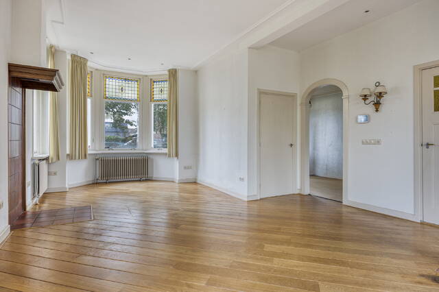 Sfeervolle lichte doorzon woonkamer (ca. 42 m2) voorzien van een lichte houten vloer, hoog plafond met sierlijsten en schitterende glas-in-loodramen. De meterkast is afgewerkt in een vaste kast. Middels openslaande deuren heeft u toegang tot de zonnige achtertuin. Via de woonkamer heeft u toegang tot de werkkamer.