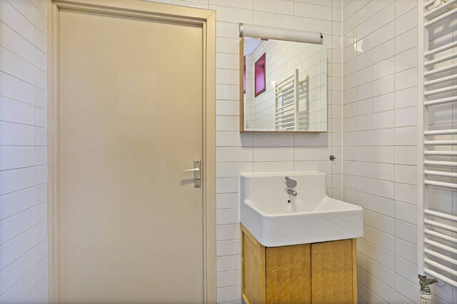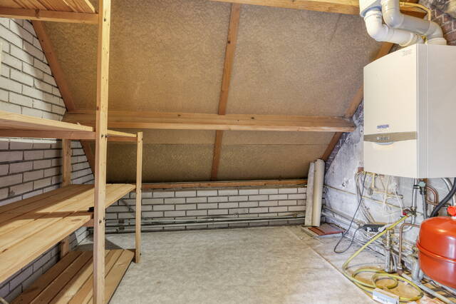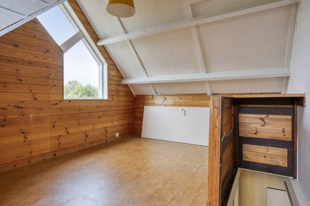 Slaapkamer 3 (ca. 8 m2) is gelegen aan de achterzijde van de woning en voorzien van linoleum vloer. Dankzij de dakkapel en het raam biedt deze kamer veel natuurlijke lichtinval.