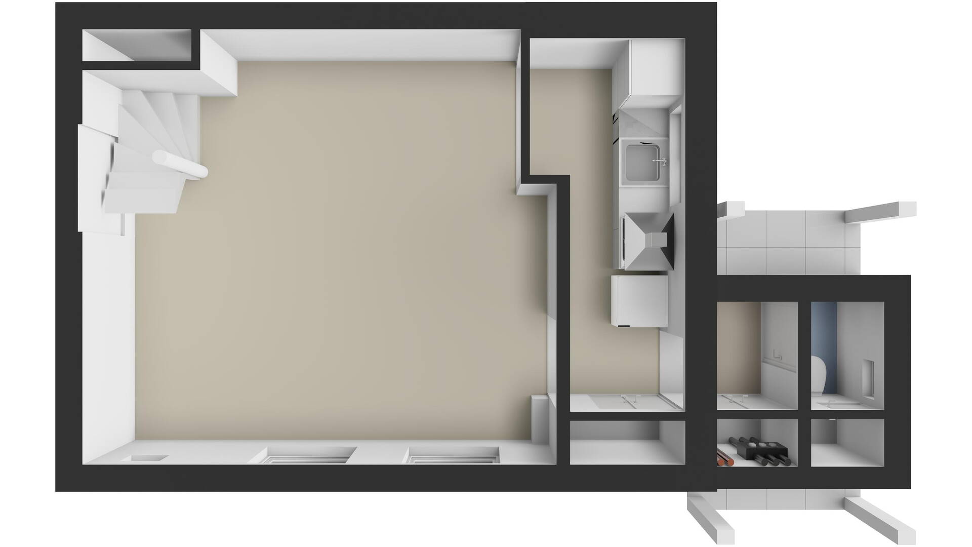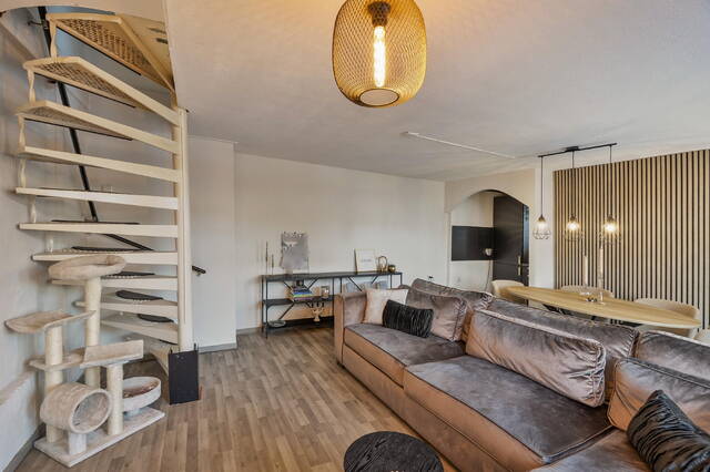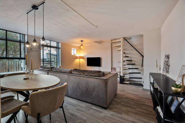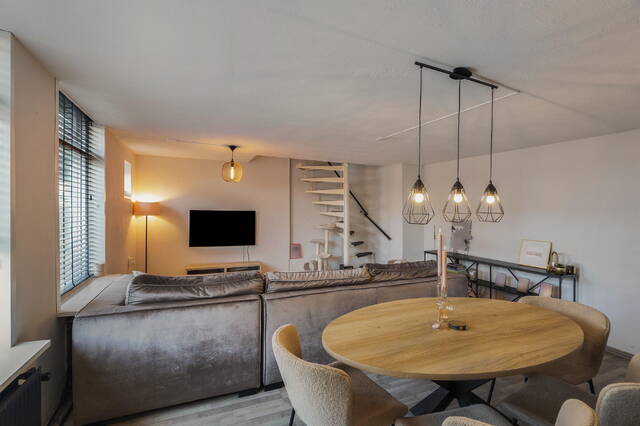 Een gezellige en verrassend ruime woonkamer met laminaatvloer voorzien van vloerverwarming (bijverwarming), ingebouwde verlichting, spachtelputz wanden en een spiltrap naar de eerste verdieping. Het is een fijne leefruimte waar je direct een warm, huiselijk gevoel krijgt.