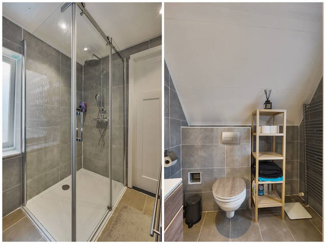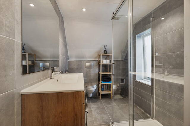 De badkamer (2019) heeft een moderne afwerking met inloopdouche, wastafelmeubel, tweede hangend toilet, designradiator en uitzetraam. Licht, fris en comfortabel.