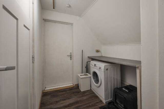 Aangrenzend bevindt zich een praktische wasruimte met opstelling voor de wasmachine en droger.