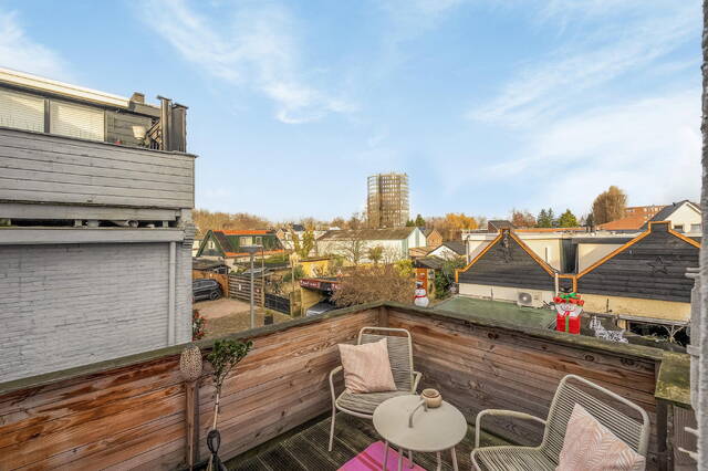 Een compact, fraai afgewerkt terras met houten vloer, gesitueerd op het noordwesten. Een heerlijke plek om aan het einde van de dag nog even in de zon te zitten en te genieten van het zicht over de wijk.