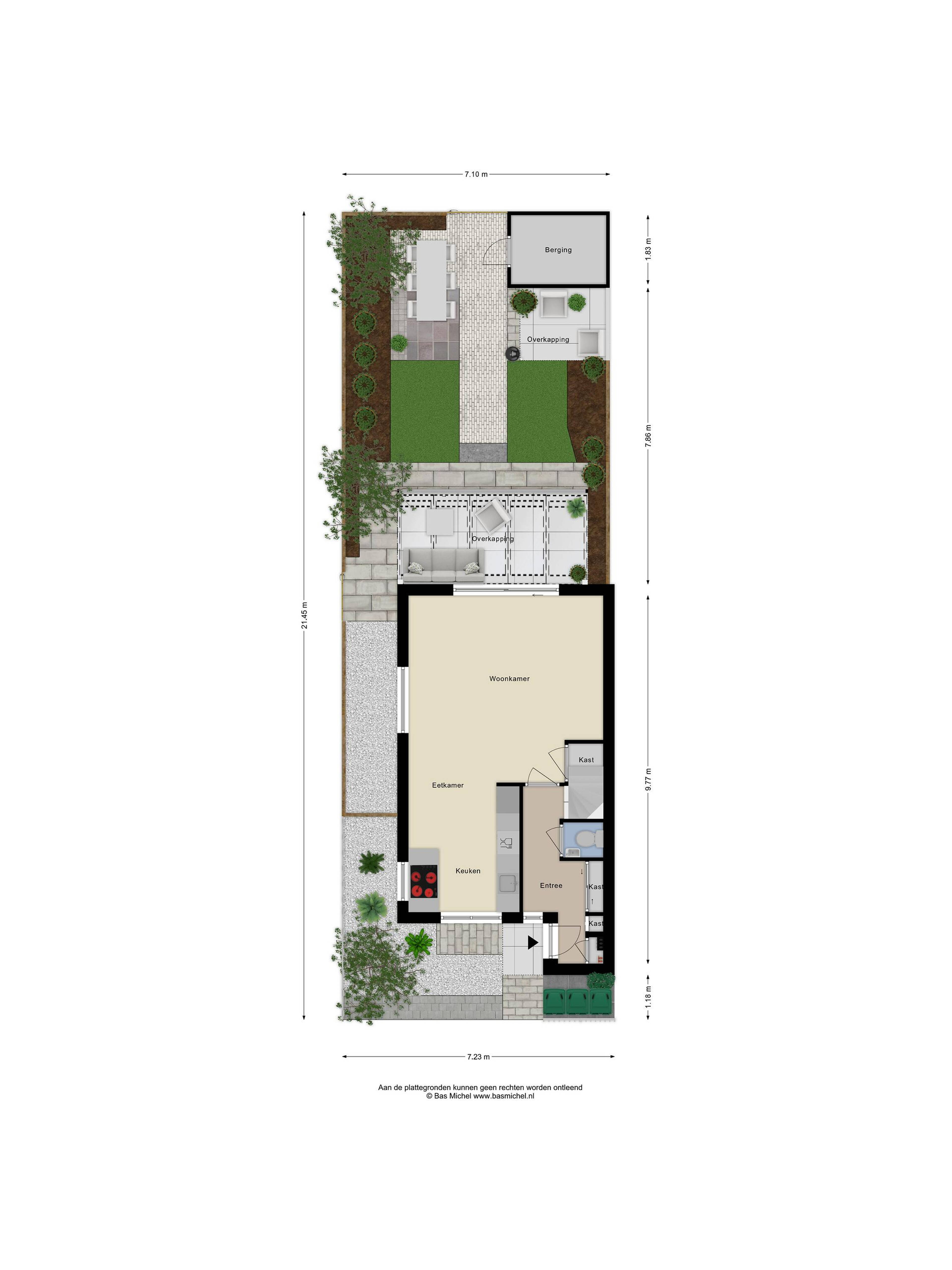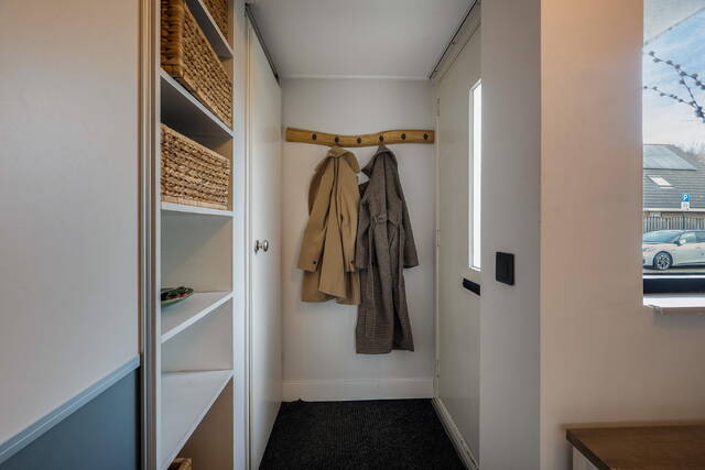 Lichte tuingerichte living (ca. 35 m2) voorzien van laminaatvloer met elektrische vloerverwarming en gestucte wanden en plafond. De woonkamer beschikt verder over een handige trapkast. Ideaal om te gebruiken als voorraadkast en/of extra bergruimte. De hoekligging, gecombineerd met de schuifpui aan de achterzijde, zorgt voor een uitzonderlijke lichtinval op de begane grond. Het natuurlijke licht stroomt overvloedig binnen en versterkt het ruimtelijke gevoel. Middels een schuifpui heeft u toegang tot de aangebouwde overkapping.