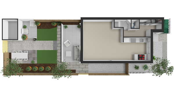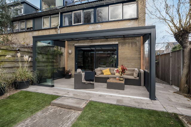 De aangebouwde aluminium overkapping (ca. 12 m2) is afgewerkt met vijf glazen schuifdeuren. Deze schuifdeuren kunnen eenvoudig worden geopend, waardoor de ruimte zowel open als gesloten gebruikt kan worden. Hierdoor benut u de ruimte niet alleen in de zomer, maar ook bij koeler of winderig weer.