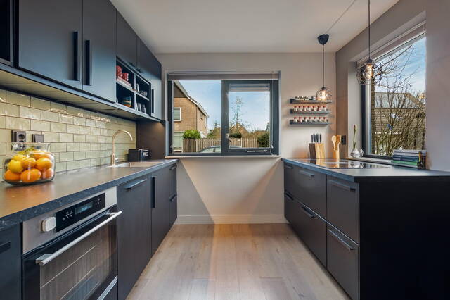 De moderne open keuken is gelegen aan de voorzijde van de woning en is uitgevoerd in een rechte opstelling. De keuken is voorzien van diverse apparatuur zoals een koelkast, vrieskast, inductie kookplaat met ingebouwd afzuigsysteem, oven en een vaatwasser. Verder is de keuken voorzien van een enkele spoelbak en voldoende kastruimte. Het geheel is uitgevoerd in zwart en afgewerkt met een kunststof aanrechtblad en laminaatvloer met elektrische vloerverwarming.
