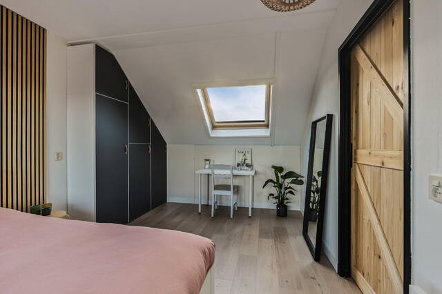 Slaapkamer 4 (ca. 18 m2) is voorzien van een Velux dakraam met hor en verduisterend gordijn, laminaatvloer, een vaste kast en bergruimte achter het knieschot.