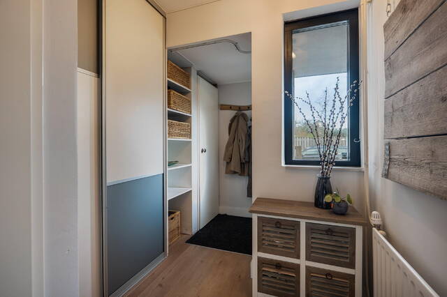Voorzolder met stelplaats voor de HR C.V. combiketel (Remeha 2022), omvormer voor de 12 zonnepanelen, mechanisch ventilatie systeem, wasmachine- en drogeraansluiting, bergruimte achter het knieschot en een Velux dakraam met hor en verduisterend gordijn. Dankzij het dakraam beschikt de voorzolder over een aangename natuurlijke lichtinval. Middels twee schuifdeuren heeft u toegang tot de slaapkamer 4.