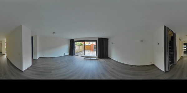 Tuingerichte woonkamer (ca. 22 m2) voorzien van een lichte laminaatvloer, een handige trapkast en elektrisch bedienbaar rolluik. Trap naar de verdieping. Middels schuifpui heeft u toegang tot de zonnige achtertuin.