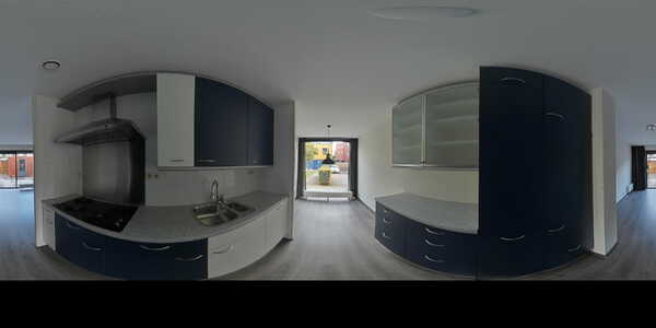 De moderne open keuken (ca. 20 m2) is uitgevoerd in twee rechte opstellingen en is voorzien van 1,5 spoelbak, koelkast met vriesvakje, 4-pits gaskookplaat, RVS afzuigkap en een vaatwasser. Het geheel is uitgevoerd in wit/blauwe kleuren en afgewerkt met een kunststof aanrechtblad, sfeerverlichting en laminaatvloer. Het aangrenzende eetgedeelte bevindt zich aan de voorzijde van de woning en vormt een fijne plek voor samen koken en tafelen. Dankzij de grote raampartij aan de voorzijde van de woning bieden de keuken en het eetgedeelte een fijne natuurlijke lichtinval.
