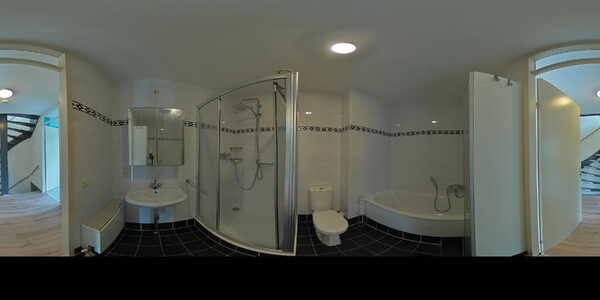Nette badkamer (ca. 6 m2) met sanitaire voorzieningen zoals een wastafel, spiegel met spiegelkast en verlichting, tweede toilet, ligbad en een douchecabine met regendouche. De badkamer is geheel betegeld met lichte grijze wandtegels en zwarte vloertegels.