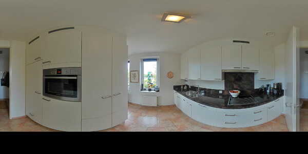 Terug in de eetkamer lopen we door naar de semi-open keuken van ruim 8 m². Een nette, in gebroken wit uitgevoerde keuken met luxe natuurstenen blad en diverse inbouwapparatuur. Zo is er een vaatwasmachine, inductiekookplaat met afzuigkap, anderhalve spoelbak met mengkraan, koelkast, vriezer en een ingebouwde oven. Daarnaast is er volop kastruimte. Door het grote raam aan de zijkant heb je een vrij uitzicht over het water en is het een heerlijk lichte keuken. Via de keuken bereik je de inpandige berging van 4 m², waar de aansluitingen voor wasmachine en droger zijn en daar tegenover een grote inbouwkast voor voorraad of keukenspullen.